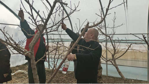 通过示范讲解,拱棚里呈现一片忙碌的景象,大家两两一组,对桃树的病残枝、背上枝等进行修剪。最终通过大家的齐心协力,将喀依乡二队的设施农业油蟠桃示范基地内大部分桃树修剪完毕。