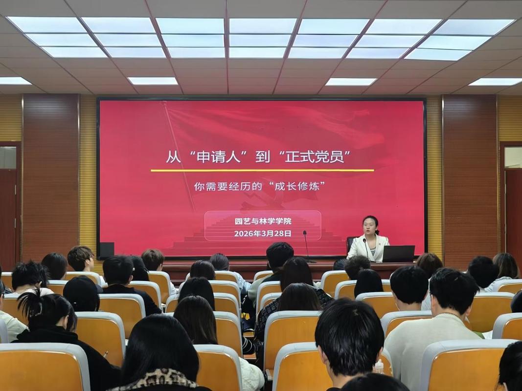3月28日下午,园艺与林学学院党政办公室(党建办公室)主任訾莉莉在园林楼三楼会议室,以“从‘申请人’到‘正式党员’——你需要经历的‘成长修炼’”为题,为学院第9期入党积极分子讲授专题党课。本次党课旨在系统梳理党员发展的阶段与要求,为积极追求思想进步和向党组织靠拢的学员指明方向、注入动力。