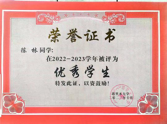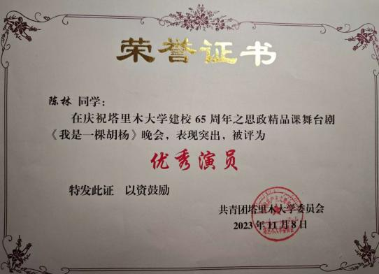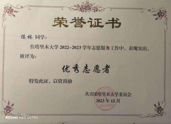 个人事迹:本人在校期间平均成绩排名专业前13%,在学习上始终以学无止境的态度锤炼自己,在此之余,还注重德、智、体、美、劳全面发展,也取得一些奖项、包括优秀志愿者、优秀学生、优秀演员、先进个人等奖项。同时也在一些创新项目上取得成绩,参与了一项校级大创项目并结项,在塔里木大学“智慧农业与智能装备创新设计大赛”取得校级三等奖,在思想上我积极向党组织靠拢,注重自己在德育方面发展,通过自己力所能及的努力带动他人积极向上主动去帮助他人解决问题。在实践方面,通过不断的校内实习实践,对于果树修剪、蔬菜育种方面都有一定了解。在今后将继续保持学习的奋进姿态,坚持自己热爱的事情,自强不息,踔厉奋发