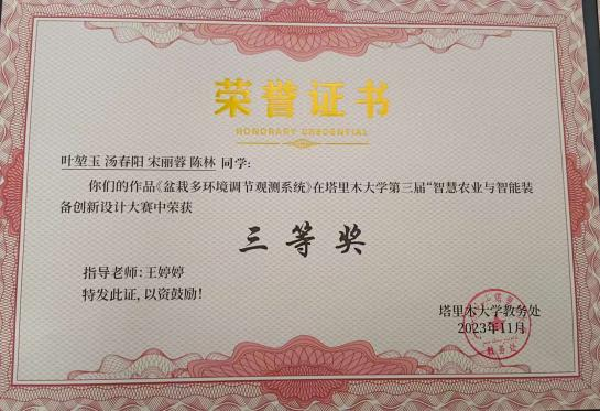 塔里木大学智慧农业与智能装备设计大赛校级三等奖