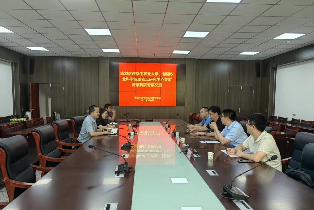 2023年8月8日,华中农业大学、新疆农科院哈密瓜研究中心孔秋生教授、张学军研究员一行来校考察,在园林楼228会议室双方就新疆西甜瓜育种、栽培现状以及新疆农科院哈密瓜研究中心教学、科研等情况进行深入座谈交流。蒋学玮书记主持了座谈会,设施工程系部分教师参加座谈。
