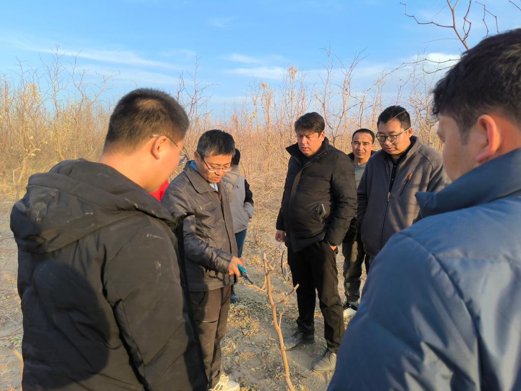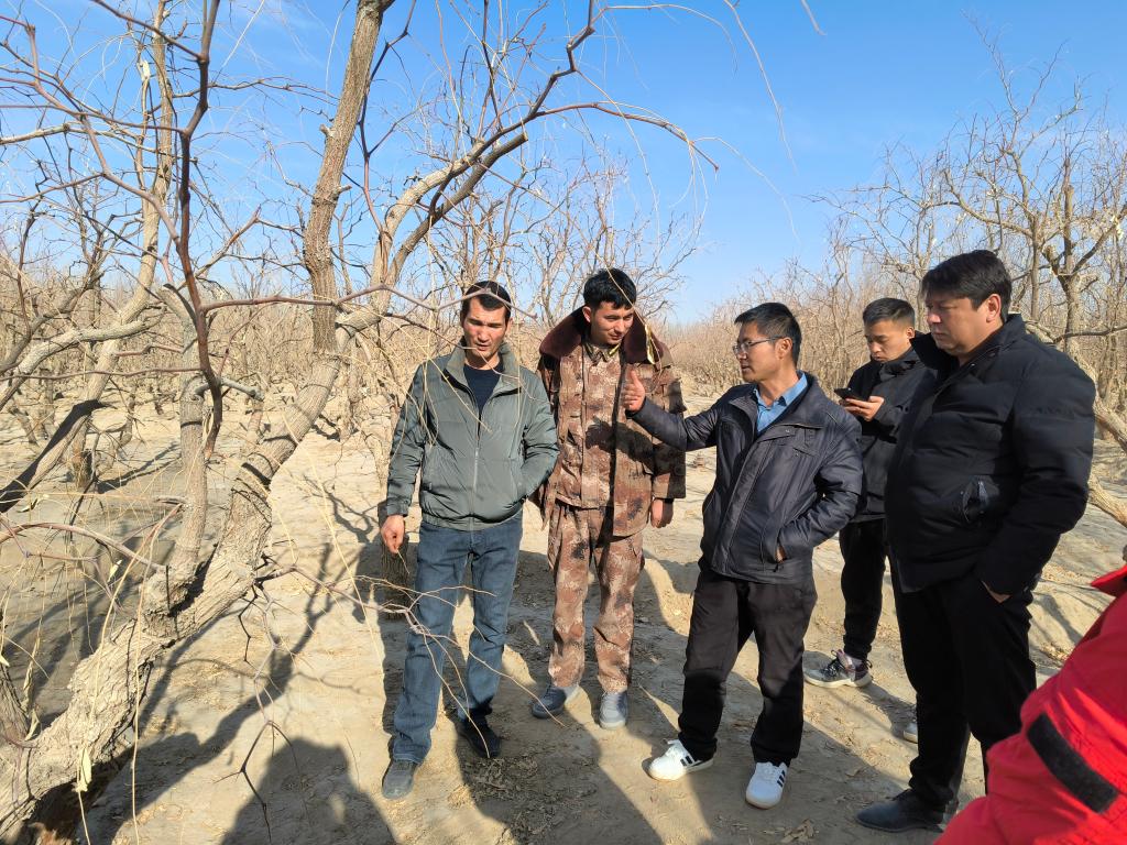 通过开展交流座谈、实地考察,针对皮山农场红枣品种混乱、树体过密、树势过高不齐、2023年受冻害等问题进行深入讨论,制订出一套冬季修剪的方案,以及夏季辅助修建的技术要点,帮助农户解决此时棘手的生产问题。在皮山农场农业发展中心主任艾可麦提江带领下,团队一行人来到皮山农场二连、八连和十连等地,通过田间调查发现枣树存在树体过高、冻害情况严重、还有嫁接接位过高等问题。针对这些问题,专家服务团队开展多次会议,参与会议的有皮山农场武装部部长刘强、党委常委副场长向春和、农发中心主任艾可麦提江和八连连长艾合买提等职工代表共同参与讨论,最终确定了修剪方案。
