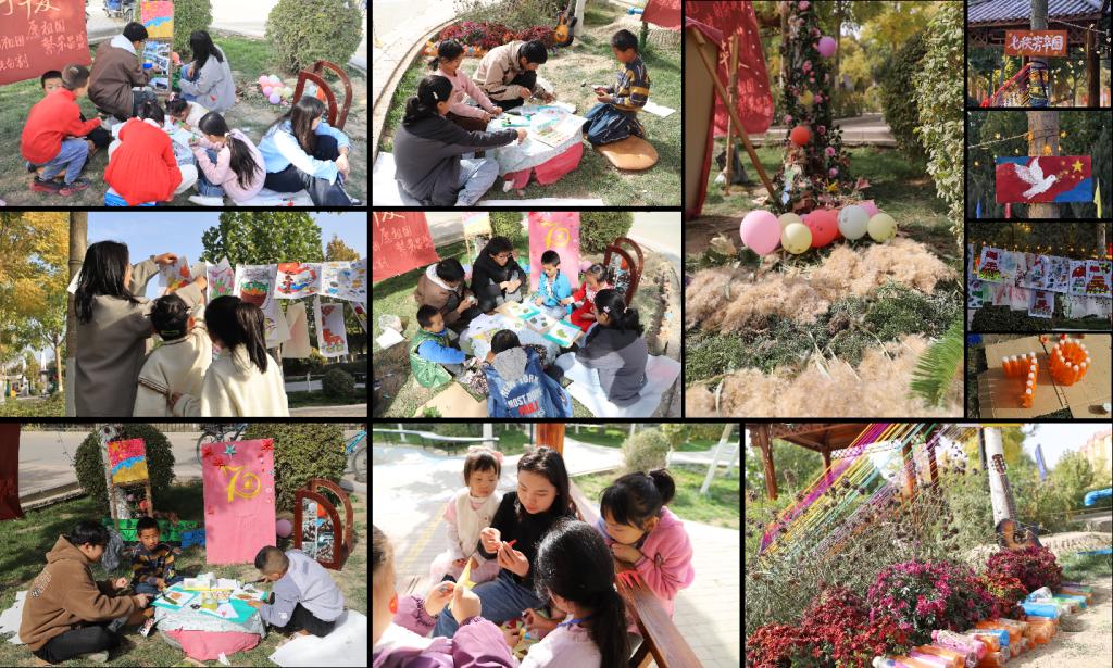 活动分为多个板块,内容丰富多彩:“同心迹”环节中,风景园林专业研究生同居民与孩子们用画笔绘祝福,用彩纸折五角星,以指尖艺术表达对家国的热爱;“绘芳华”区域结合彩虹线打卡与秋日植物拓印,让参与者在自然与艺术的交融中记录新疆秋日美景;“共生墙”由林业专业研究生与居民齐心打造花墙,展现园艺与手工艺术的完美结合;“焕新生”活动鼓励居民彩绘废旧瓶,传递环保理念;“续传承”板块以老照片讲述“三五九旅”的垦荒历史,年轻父母带孩子认真聆听,兵团精神在代际共鸣中延续。
