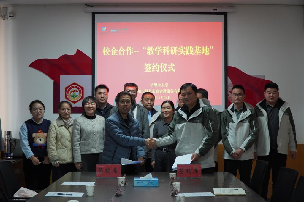 为深化校企合作,推动产学研深度融合,11月26日,塔里木大学园艺与林学学院与阿拉尔市绿景市政建设服务有限公司双方携手在绿景市政公司二楼会议室开展“访企拓岗”交流并成功举行“教学科研实践基地”签约暨揭牌仪式。园艺与林学学院副院长吕瑞恒、吴庆明,新疆西北兴业城投集团有限公司党委副书记、工会主席付艳,绿景市政建设服务有限公司党总支书记、执行董事朱文林,绿景市政建设服务有限公司相关部门主管人员、学院林学园林系教师、阿拉尔市园林植物科技小院首席专家冯建菊教授与部分专业教师、科技小院驻扎研究生共同参加了仪式,仪式由朱文林主持。