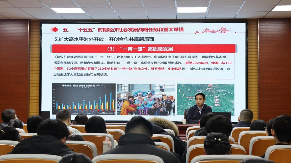 宣讲中,张宏荣回顾“十四五”时期经济社会发展重大成就,重点凸显学校管理、教学作用充分发挥的亮点成效,强调学校为学子知识技能的学习筑牢坚实支撑。针对党的二十届四中全会明确的“十五五”时期13个方面任务,他聚焦、特色现代化产业体系建设、科技创新强化等核心做出深入阐释,明确学校将紧扣实际发展需求,以实践为导向优化人才培养体系,建立专业调整联动机制,精准对接发展需求。