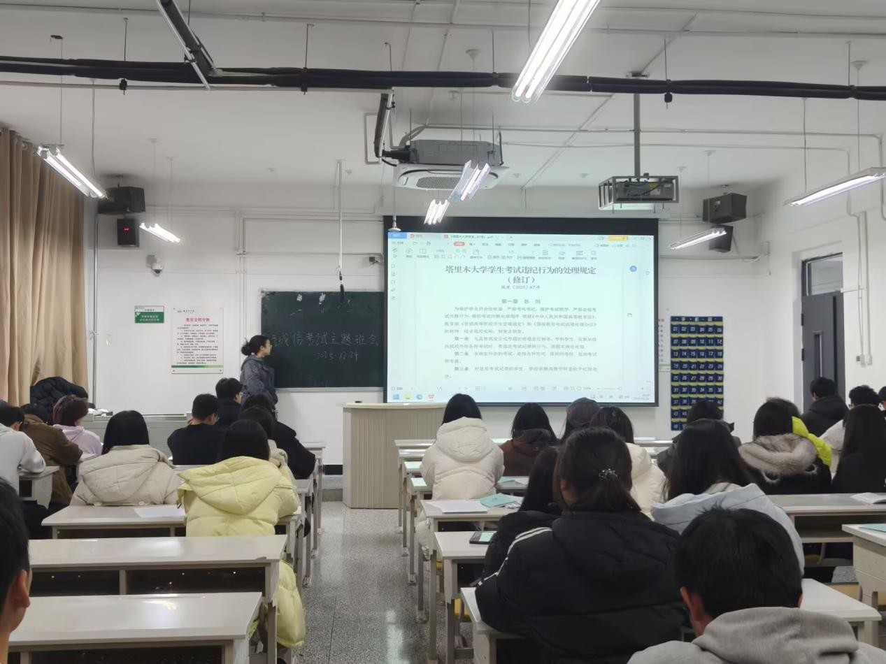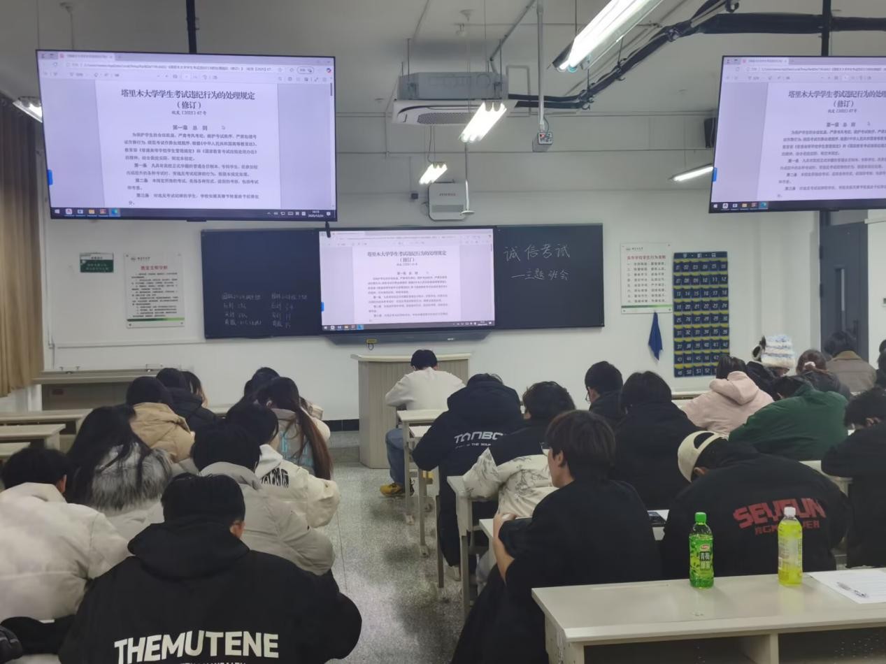 班会紧扣“诚信”主题,各班通过领学文件、剖析案例等形式展开。会上,全体学生认真研读了《塔里木大学学生考试违纪行为的处理规定(修订)》(校发〔2025〕67号),对考试违纪作弊的界定及处分细则有了清晰认知。随后,班会重点通报了《关于对霍佳贺等8名同学考试违纪的处分决定》(校学发〔2025〕48号),通过剖析期中考试中的真实违纪案例,为同学们敲响了警钟,让大家深刻体会到学校对学术不端行为“零容忍”的态度。